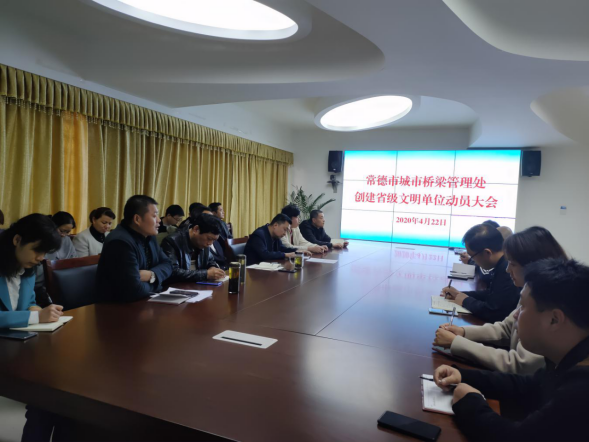 为使常德市城市桥梁管理处精神文明建设迈上一个新的台阶,打造健康向上道德风尚,建设特色鲜明单位文化,推进创建活动深入开展,全面提升文明单位形象。4月22日上午,常德市城市桥梁管理处组织召开了创建省级文明单位动员大会,就开展创建省级文明单位进行全面动员部署。会议由程国锋副主任主持,刘臻主任作动员讲话,市桥管处全体干部职工参加会议。