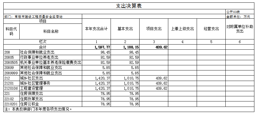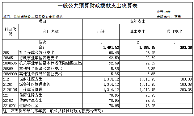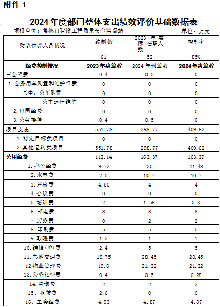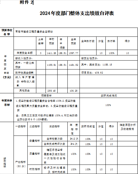 2024年度本部门(单位)整体支出全年预算数1155.81万元,执行数1491.52万元,完成预算的129.04%,绩效自评得分90分,评价等级为“优秀”。绩效目标完成情况:一是受监的建设工程质量安全合格率100%;二是受监的建设工程无重大质量安全事故。三是受监的建设工程质量安 全、农民工工资支付投诉处理率100%;四是对工地的扬尘防 治实行6个100%管控,配合生环局确保我市空气质量优良天数达标。发现的主要问题及原因:一是近年来,虽然我站承担的房屋建筑工程和市政基础设施工程项目监管任务明显减少,但新增了打非治违职能,既有住宅加装电梯工程、居民自建房监管任务,且二次精装修工程监管任务明显增加;与此同时,受财政影响,目前仍有空编未招考,在岗人数并未增加,与省内其他地州市对比,“人少事多” 现象尤为突出;二是我站现为正科级公益类事业单位,随着现有职能的增加,工作任务的增多,需加强与工信局、环保局、市场监管局、城管局等部门的联动,但受限于机构级别,部门联动性受限。三是预算支出执行偏离绩效目标情况。整体绩效的成本指标 控制数总是控不住。原因:一是人员工资年初预算数是以前一年10月份工资为基准,而到当年工资基数都会上调或人员异动情况发生,因此为减少偏离值来年成本控制数目标值将扣除人员工资这部分支出;二是超收分成一般要在年底才能结算完,会有部分资金结转至下一年,由于建筑市场萎缩,此问题 可能会减小。下一步改进措施:一是队伍素质水平“再提升”。通过外地学习交流、人才 引进、讲座培训等方式,多层次、多角度提升人才队伍的整体水平。二是党建与业务“再融合”。通过党建进工地、统一监管 处置措施、推行监督执法全过程记录,实施不见面审批等方式, 全方位、宽领域打造透明化、法制化、服务化的“三化”清廉 机关。三是质量安全监管水平“再拓深”。通过强化层级监督、前移监督关口、延伸监督检查等方式,立体化、深层次拓展常 德地区的质量安全监管力度。四是进一步提升财务管理水平。